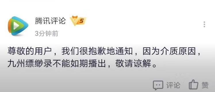 浙江卫视《九州缥缈录》原定于3日晚22点开播,但却在开播前十多分钟宣布撤档,腾讯视频、优酷也没有更新。官方给出的理由是“因为介质原因,九州缥缈录不能如期播出,敬请谅解”。