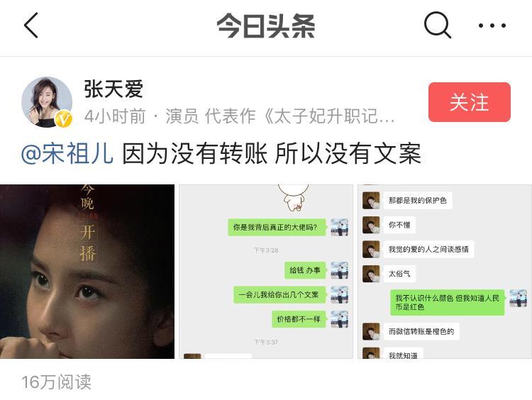张天爱还把宋祖儿求她发文宣传的私信都给晒出来了,结果,却换来撤档!史无前例的被动打脸,很尴尬了。