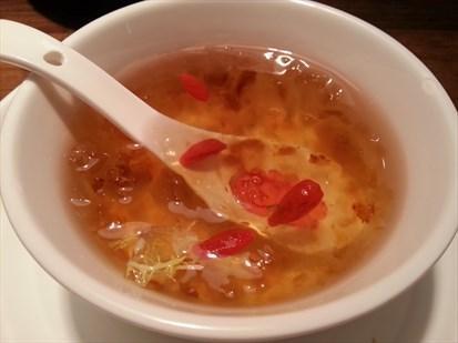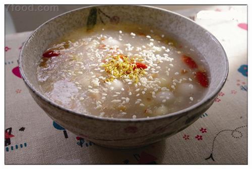 桃浆羹的原料也很特别,桃浆的那种很天然的,桃树上有裂口,经过雨水的冲洗,会有树胶渗出树干,汁液会凝结成固体,这就是桃浆。桃浆羹的做法很简单,就是先把桃浆放在清水里泡上一天,它会长起来,然后洗干净,放入锅中加水,再加入冰糖,也可以根据个人的口味,加一些枸杞或是雪梨之类的水果,煮沸5分钟左右,然后盛出即可食用啦。而且桃浆羹有清凉去火兼具美容的功效哦。