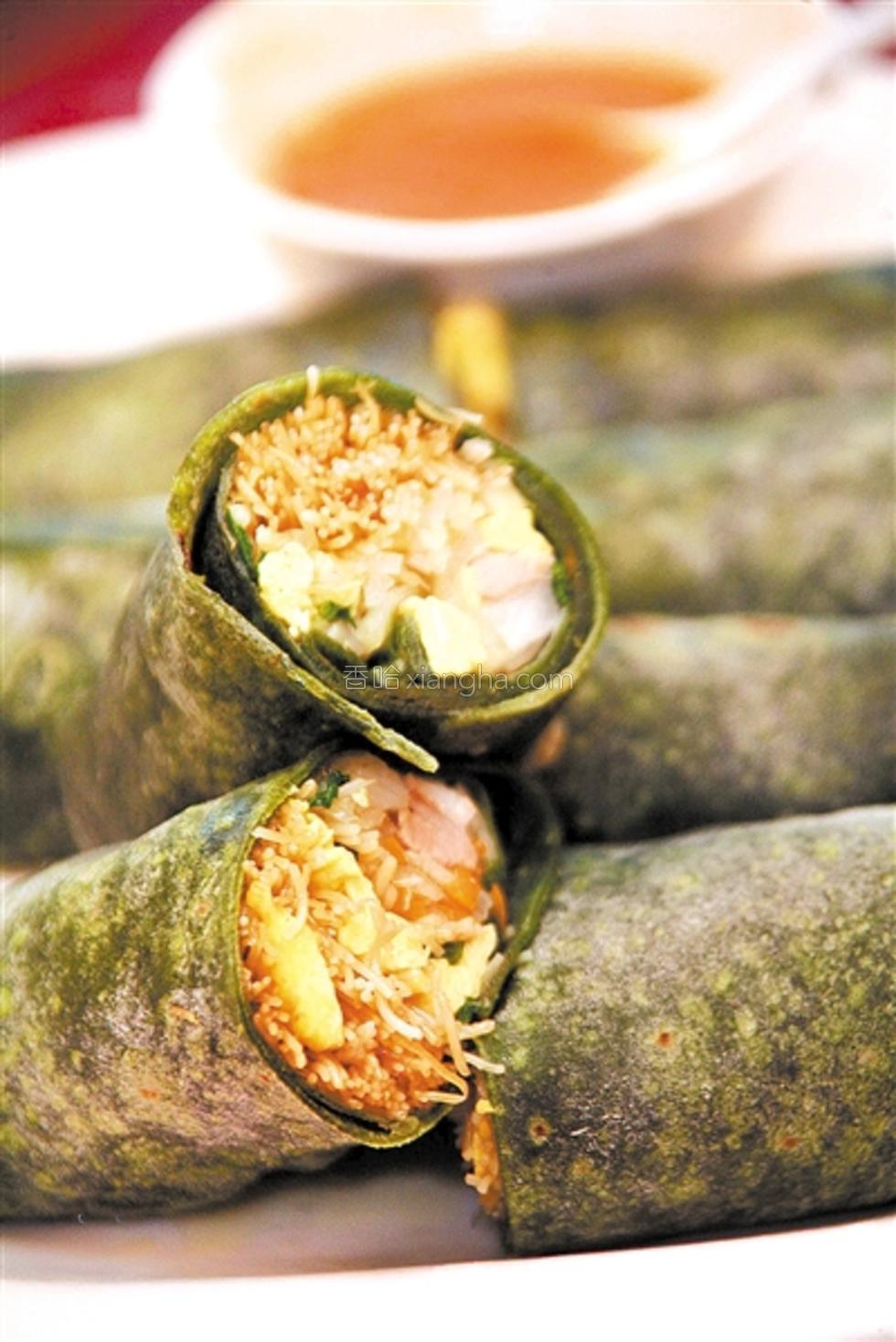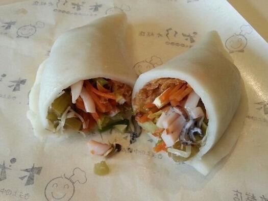 温岭人所吃的麦饼,其实就是“春卷”一类食品。用黄花麦果、苎(麻)叶、菜叶等捣成泥,掺进面粉中揉成青色的面团,再用不到一尺长的短擀面棍擀成一张张直径一尺左右的圆饼,放在锅中烙熟即成(也有用掺入一定量糯米粉做成的麦饼,叫糥米麦饼,吃起来比麦做的麦饼要嫩糯)。裹入 黄鳝段、虾仁、粉蒸肉、面鱼、墨鱼卷等各种蔬菜馅料就成“麦饼筒”了