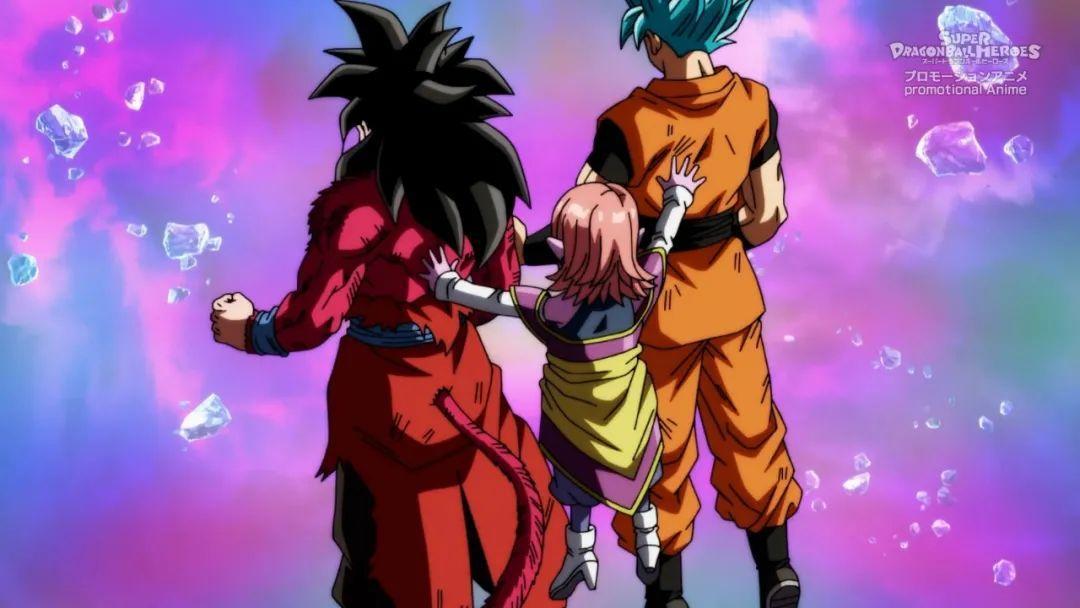 就如同时之界王神所说的那样,通过她的力量,两位孙悟空将气融合,然后并肩作战,一同打败变成少年的弗。