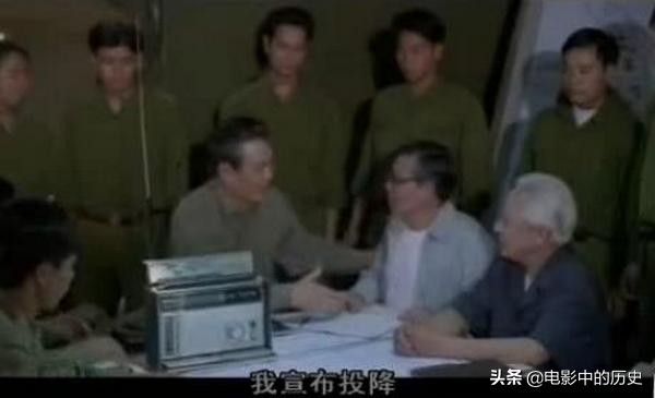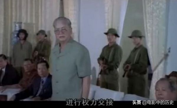 影片中端坐在总统府会议室内的南越内阁官员们看到北越人民军进入,集体起身迎接。这里也有两个不同于陈文荼回忆录的地方,一是内阁官员是围坐在一个椭圆形的会议桌旁,但片中没有会议桌,二是特工刚进入会议室时,尽管叫嚷着缴枪投降,但会议室中的内阁成员既没有吱声也没有起立,直到才某某、裴文东等大领导走进会议室时,他们才起身迎接。