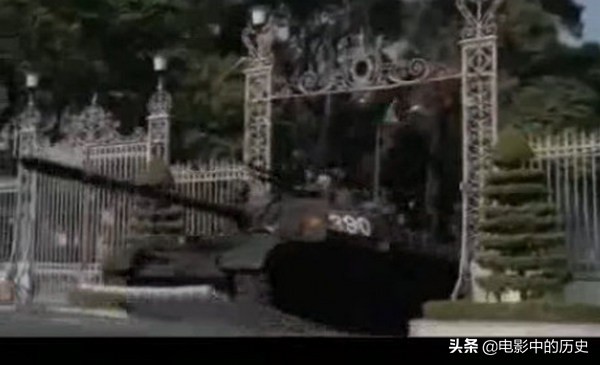 1975年4月30日中午11点10分,在地下党的引导下,北越人民军的T-54坦克撞开南越独立宫的大铁门,驶入独立宫院内。影片中第一辆驶入独立宫的坦克编号为390,但实际上应为843。