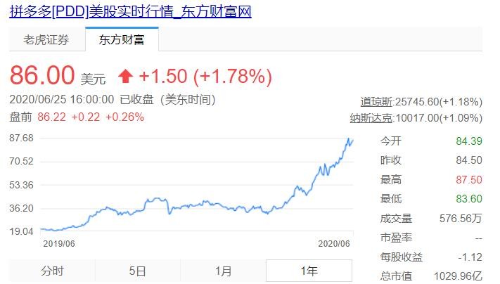 数据显示:成立于2015年的拼多多,用五年时间,把市值做到了千亿美元。6月16日,拼多多一度大涨7.5%,股价达88.96美元/股创新高,市值破千亿美元。截至收盘,其报收78美元,总市值934.1亿美元。今年一季度财报显示,拼多多的年度活跃买家数已经达6.28亿,高于2019年第四季度的5.85亿,单季度增加了4290万,相比2019年同期,增加了1.85亿,同比增幅42%;平均月活用户数达到4.87亿,较2019年同期增长了1.98亿,同比增幅68%。同时,拼多多的单用户消费额也在提升。截至2020年3月底,拼多多平均每位活跃买家的年度支出金额达到1842.4元,比2019年同期的1257.3元增长47%。