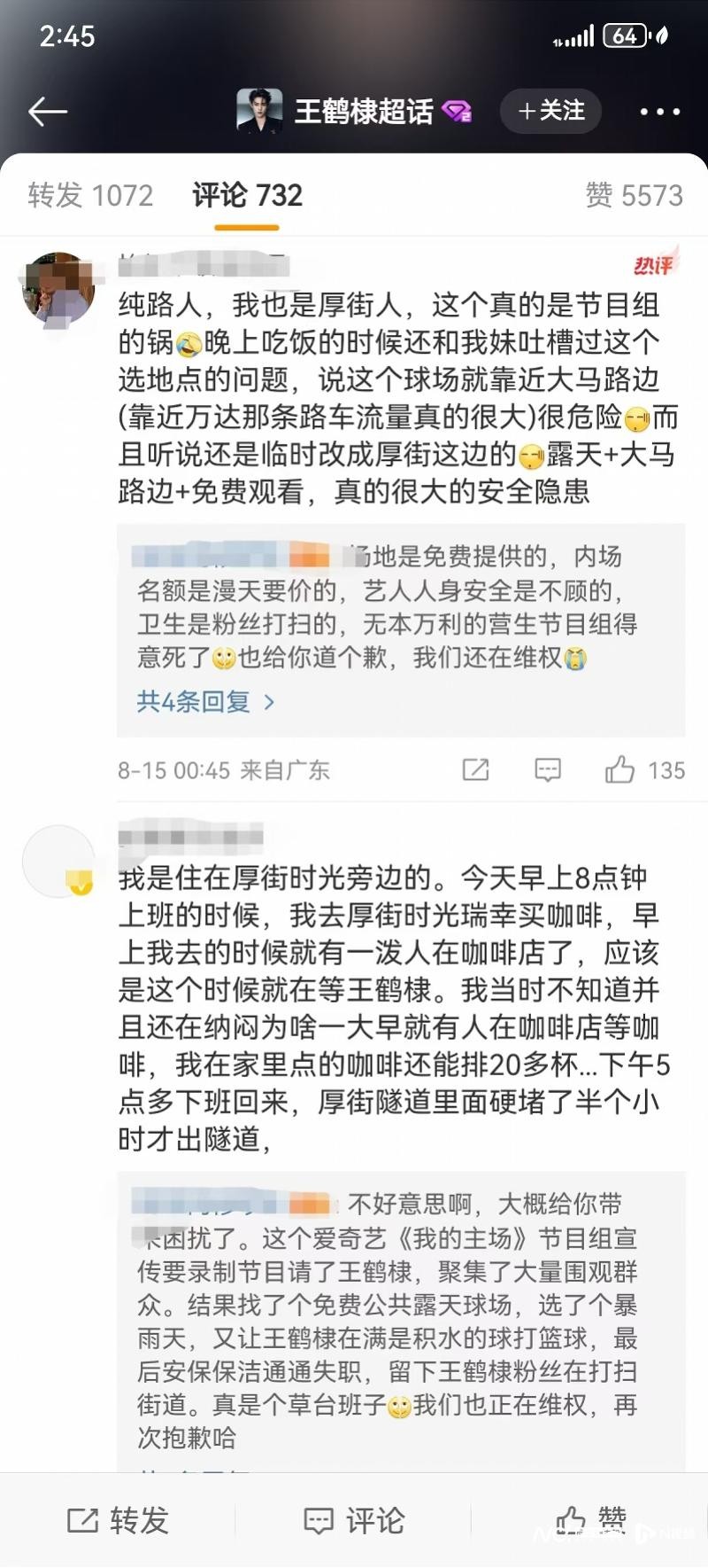 粉丝们也在表达不满和维权:活动在公共露天球场举行,当天下过暴雨后,场地湿滑甚至还有积水并不适宜打球;甚至活动结束后,场地的清扫工作还是由王鹤棣粉丝完成了善后,吐槽节目组是“草台班子”。此外,网上还传出王鹤棣受伤的消息,但目前尚未被证实。