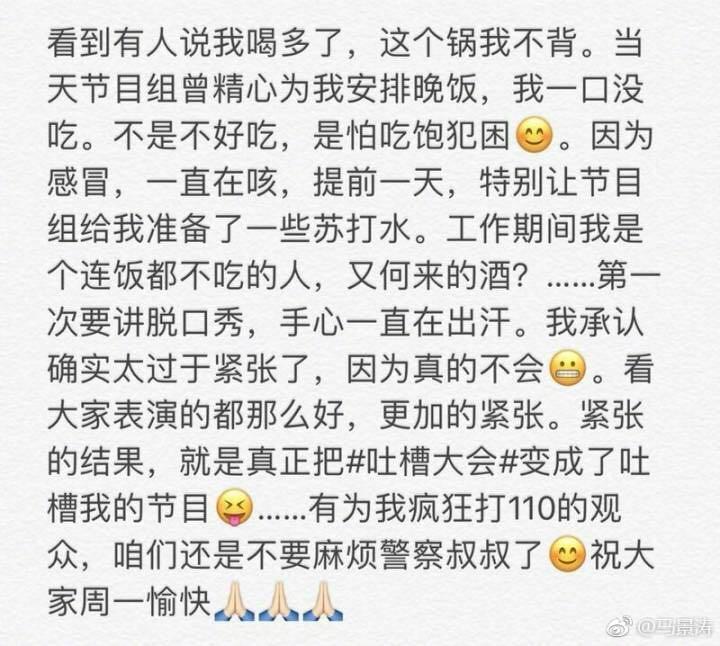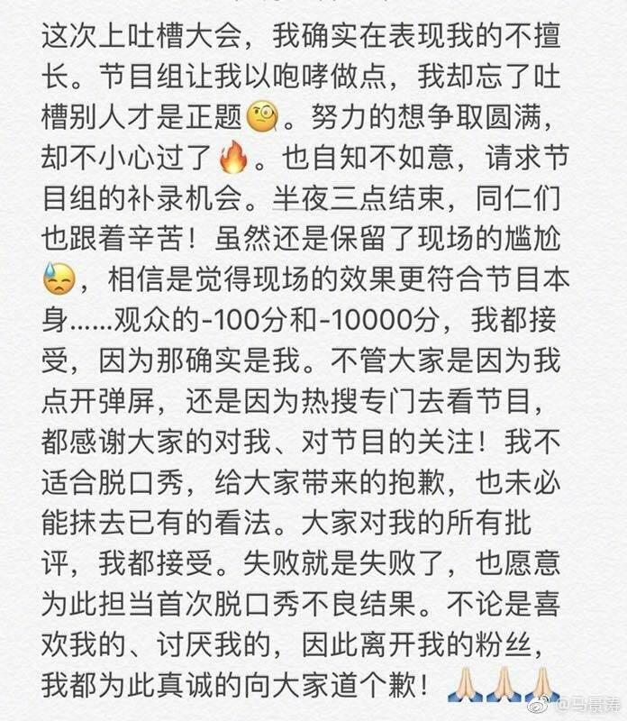 节目组要求马景涛以“咆哮”为点,他却演上了咆哮,估计没有真正领悟到要求的核心,结果还是尴尬了。从马景涛的道歉文字来看,节目录了二次,估计一直不满意,结果还是很失望,可能他们找错了人,其他人又请不来,只好赶鸭子上架,结果差点毁了节目。马景涛其实没必要道歉,可能是怕网友误会,借以澄清自己不是不努力,而是根本就没有那个吐槽的本领。