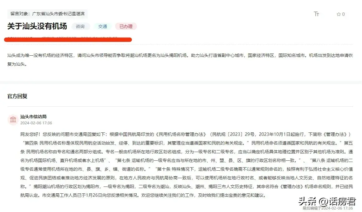 建议潮汕机场更名,官方回复称,揭阳潮汕机场的命名符合《管理办法》机场命名规则,并已经民航局认定。但这并未平息网友的热议。