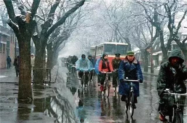 20世纪80年代初,北京东城区南池子冬天的早晨,人们冒着风雪去上班。