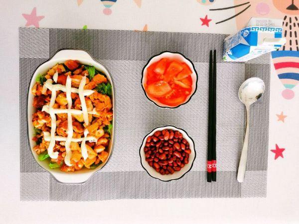8、盛一些米饭,把烤好的鸡肉切小块儿,放上配菜,根据个人口味加点沙拉,再来一罐安慕希酸奶,好吃营养的午餐。(可以不放米饭,好吃,营养,低热量的家庭烤肉拌饭)