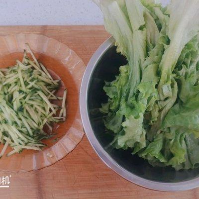 7、准备配菜,黄瓜切丝,生菜切小段,洋葱切丁。