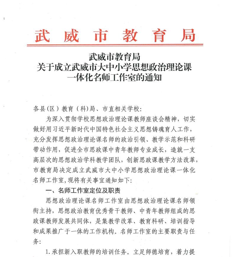 武威市思政课大中小一体化建设名师工作室,是武威市教育局在2022年3月18日授牌成立的,名师工作室设在武威一中,由武威一中高级教师刘延平领衔主持,聘任武威职业学院党委副书记翟存祥和教育部德育工作专家指导委员会委员、甘肃省中小学思政课一体化专家委员会副主任委员曹生财为工作室特聘专家,在全市高中阶段、义务教育阶段学校中遴选20名左右团队骨干成员组成。