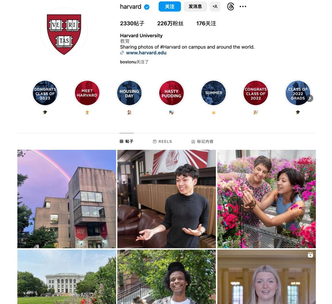 哈佛大学平均一条Ins帖子会有过万的点赞,与近百的评论互动量,这里面会有在校学生,也有许许多多仰望着期待有一天能走入哈佛校园的各国学子。