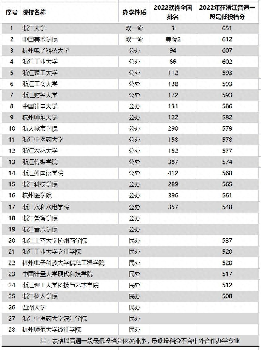 这是杭州市28所本科层次的高校排名情况,表格根据这些高校在2022年浙江省普通一段最低投档分依次排序,综合实力排名可参考软科全国排名!
