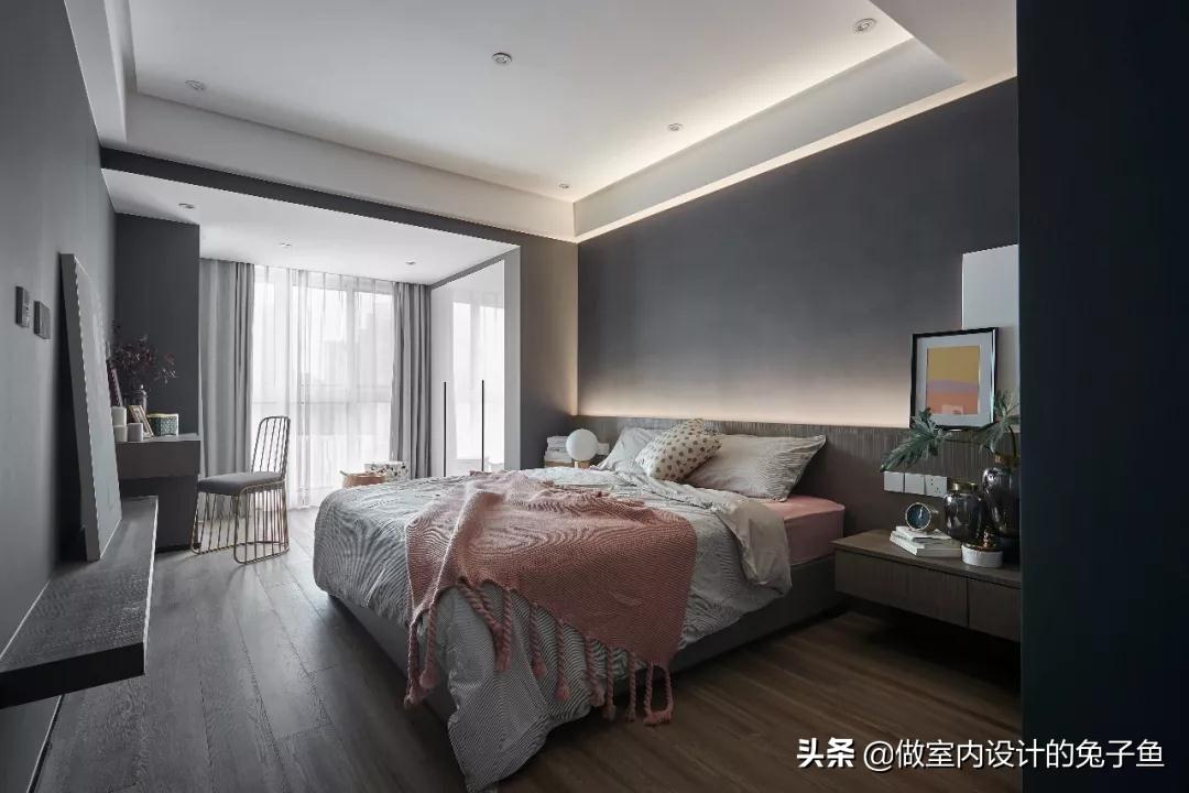 深灰色使用在主卧中,打造出的是利落、沉静的环境氛围,可作为装饰色局部使用,也可较大面积使用,搭配较鲜艳的饰品,或设置灯光能够在一定程度上缓解较大面积使用时略有的压抑感;但如果主卧面积较小或采光较差我认为不宜较大面积使用,因为深色会有一定的"缩小感",而且采光较差会让颜色"加深",所以卧室在视觉上会"更小",考虑在内。
