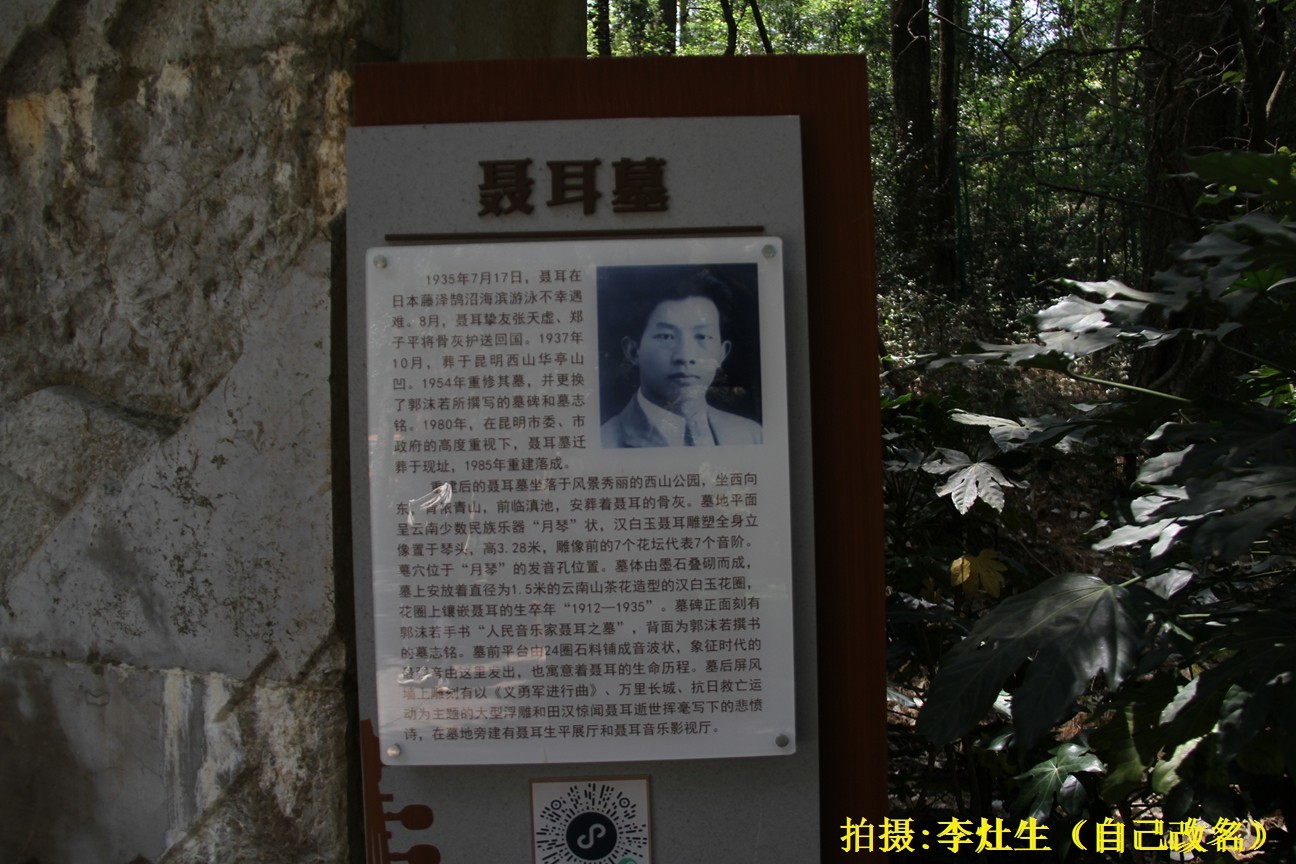 聂耳(1912-1935)是云南玉溪人,中国著名的作曲家,《义勇军进行曲》作者,出生于清寒医家,1933年入党,1935年在日本溺水逝世,1938年归葬于昆明西山。1954年重修聂耳墓,墓碑上镌刻郭沫若手书"人民音乐家聂耳之墓"。1980年5月昆明市将聂耳墓迁于西山太华寺与龙门之间,新墓形似一架弹拨乐器。原墓志铭由大文豪郭沫若书写。另外,聂耳遇难地日本藤泽市鹄沼海岸立有纪念碑。
