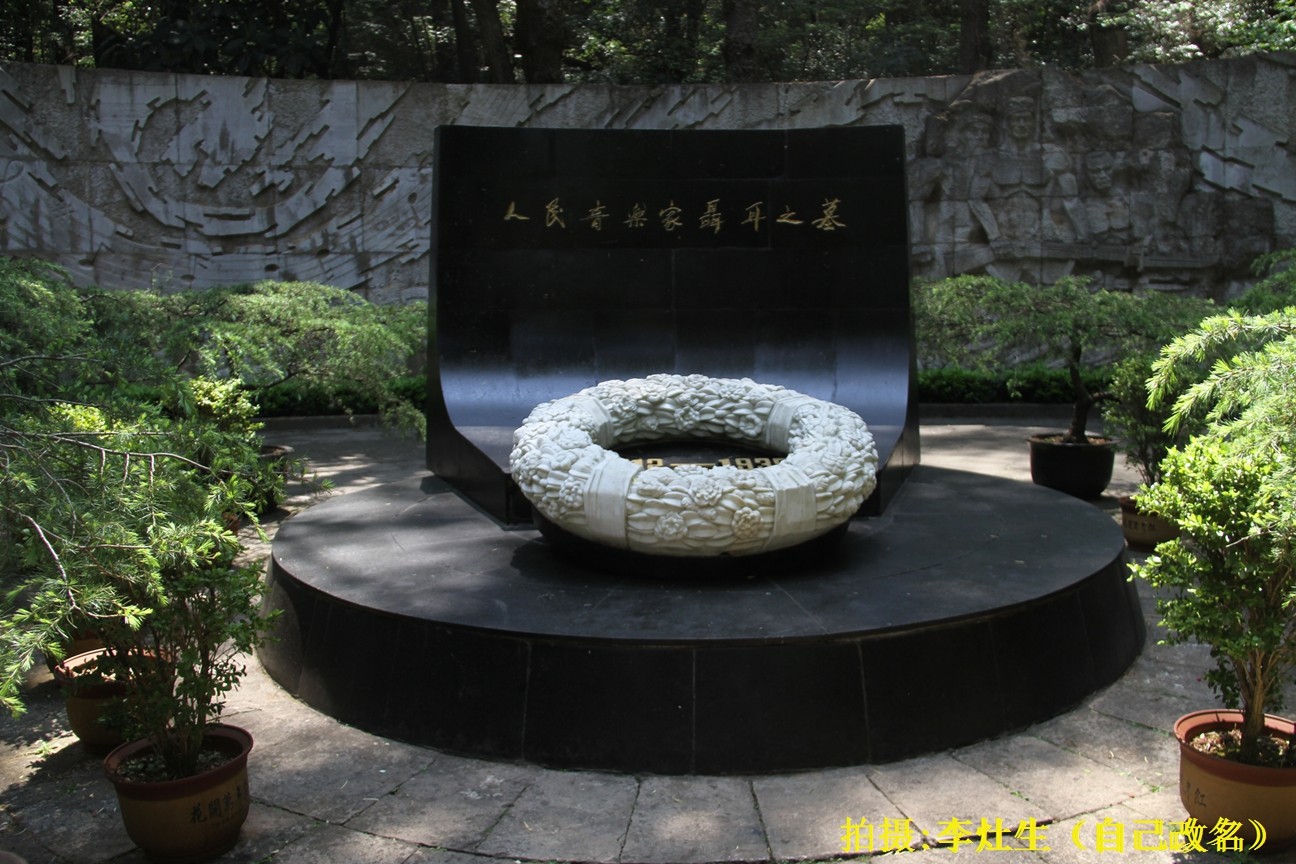 在墓的正中央前方,是白色巨大的聂耳雕像,雕像耸立于树丛之中。来到聂耳墓前,一块大的黑碑,上刻“人民音乐家聂耳之墓”,下方应该就是墓体的圆体。一个妇女,站着向聂耳墓行鞠躬之礼,她的女儿,一个女学生行举手之礼。