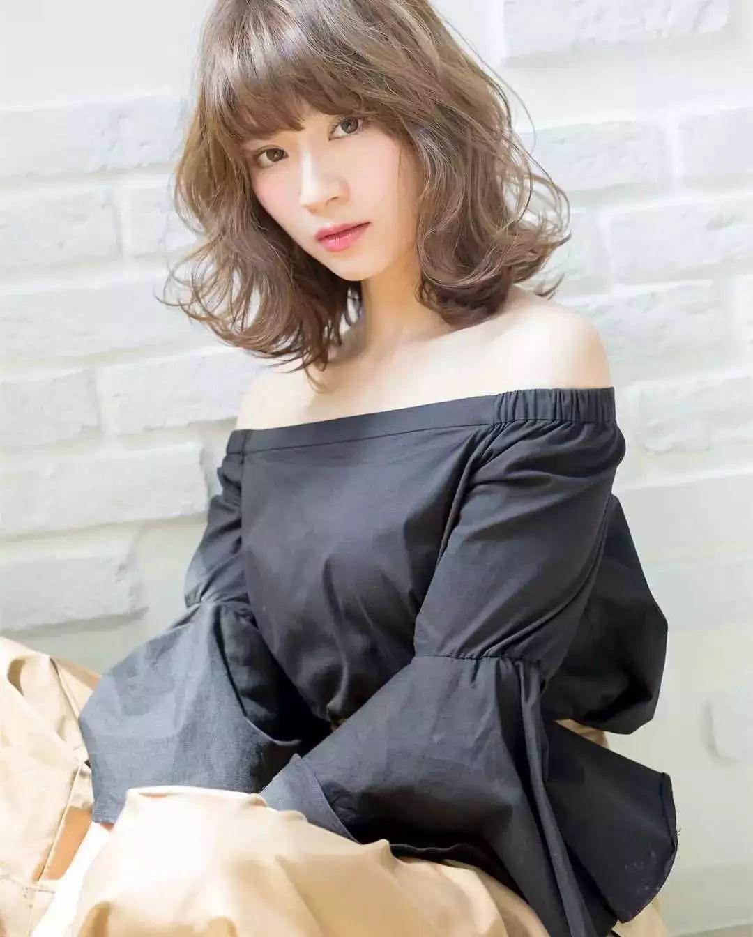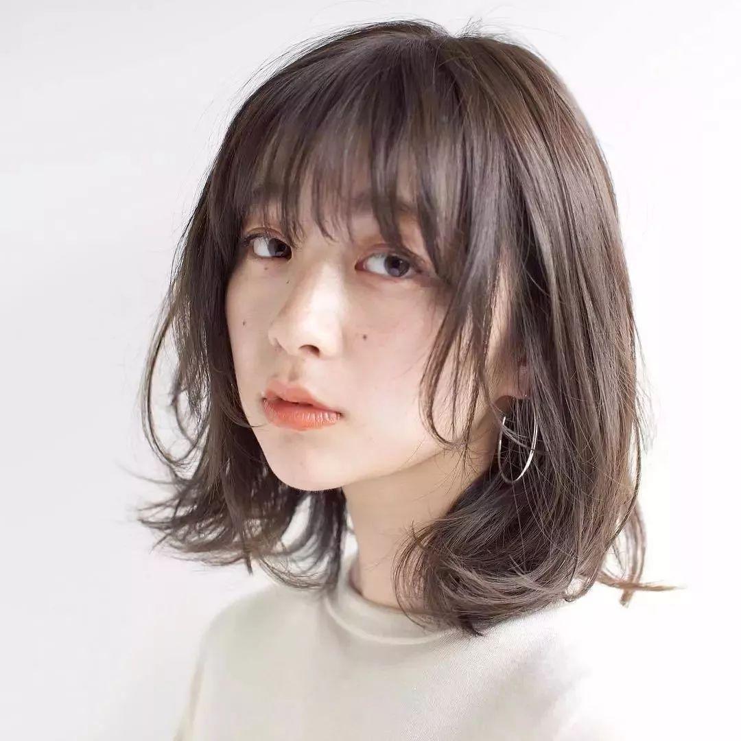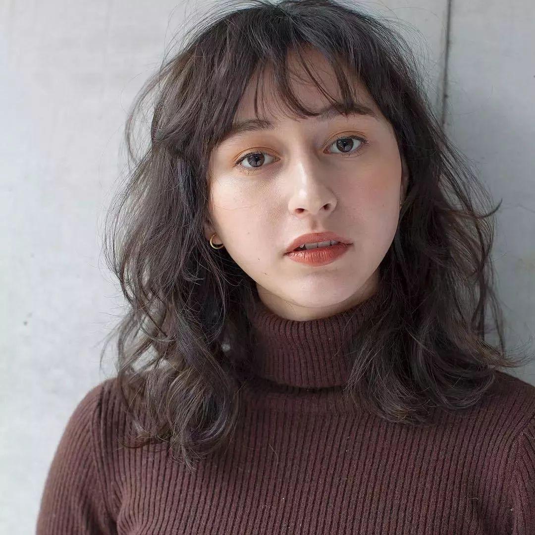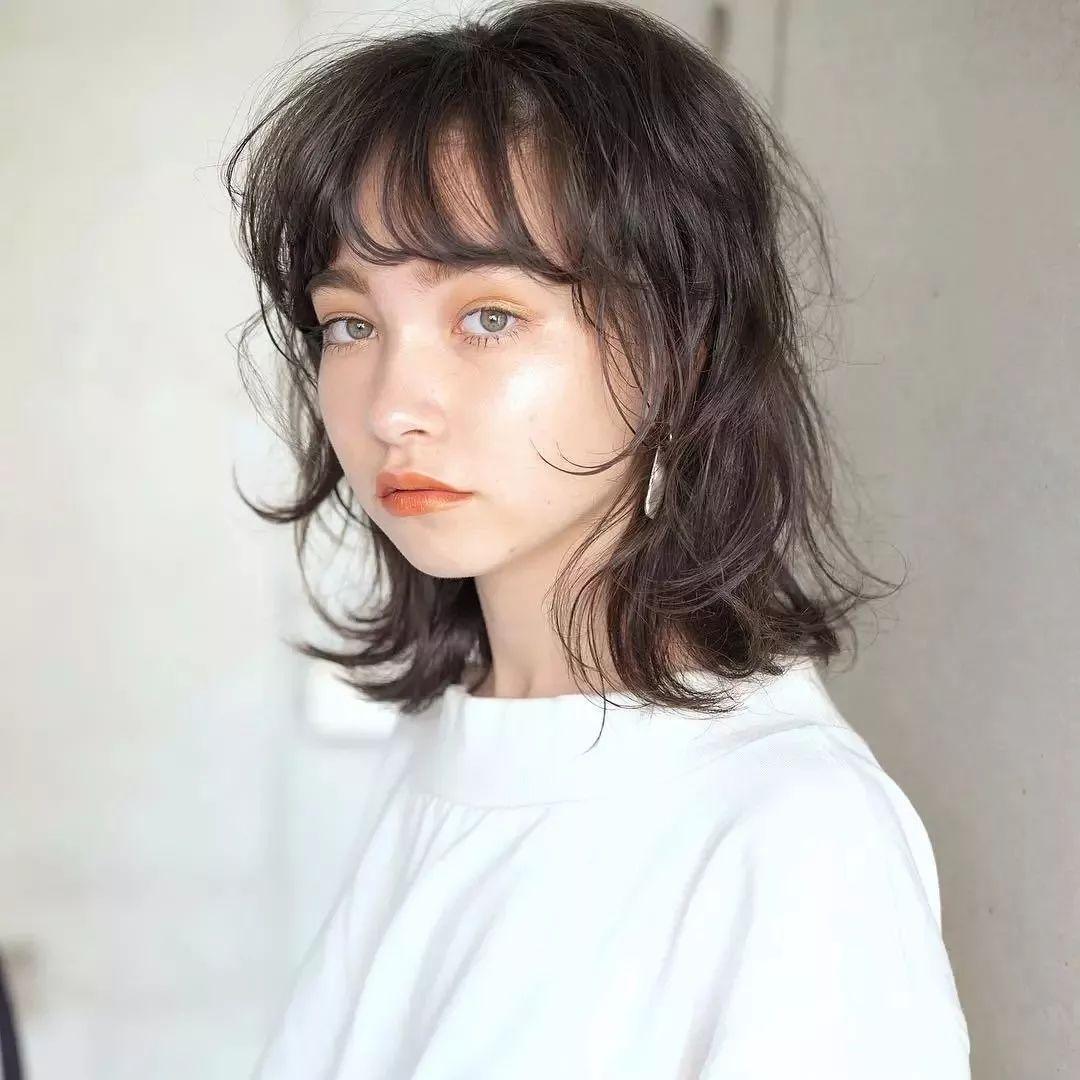 齐肩微卷搭配轻薄的刘海非常修颜,不会显得服帖,带点蓬松感的头发更适合发量少的妹子哦。
