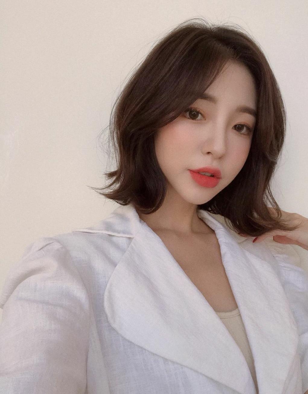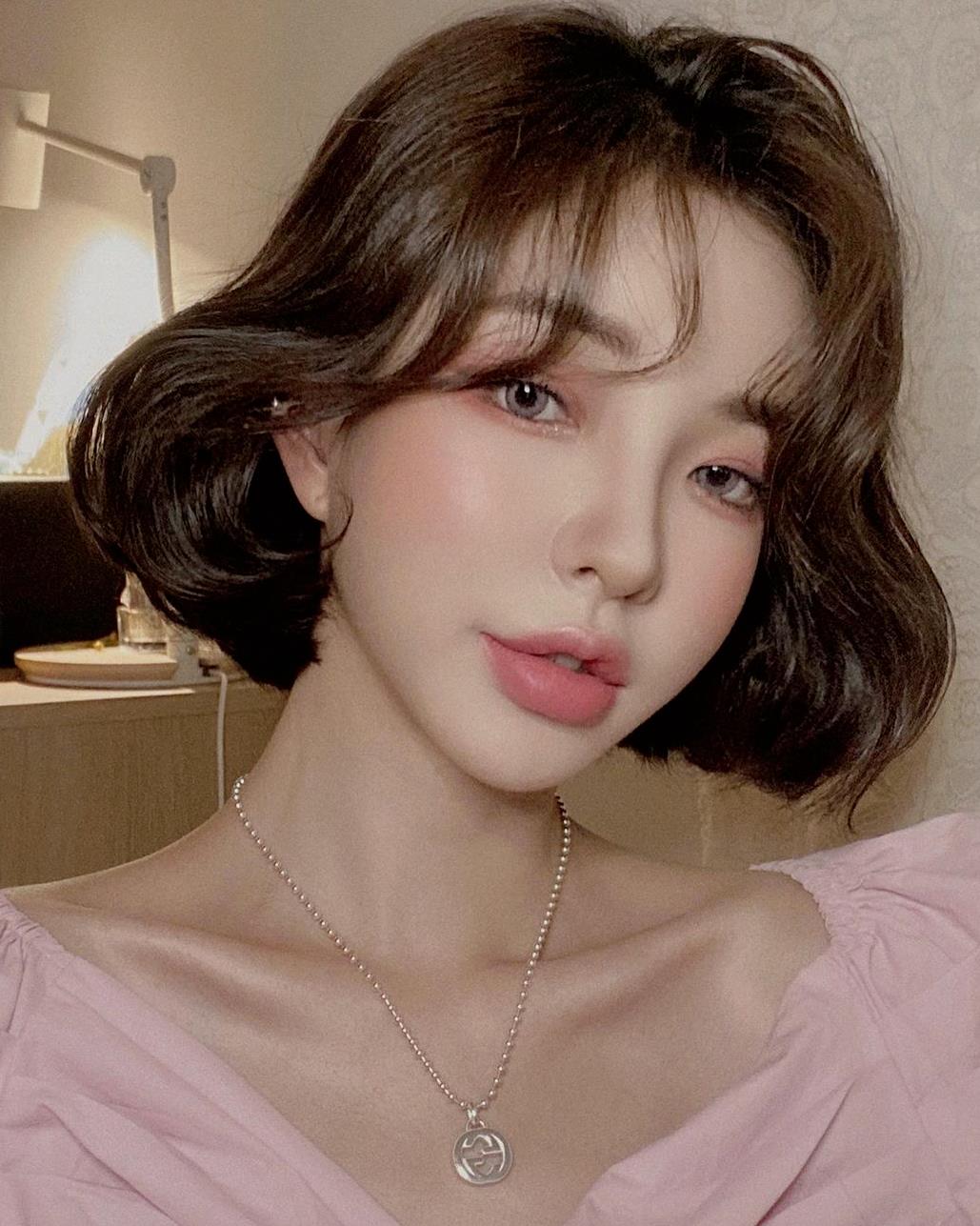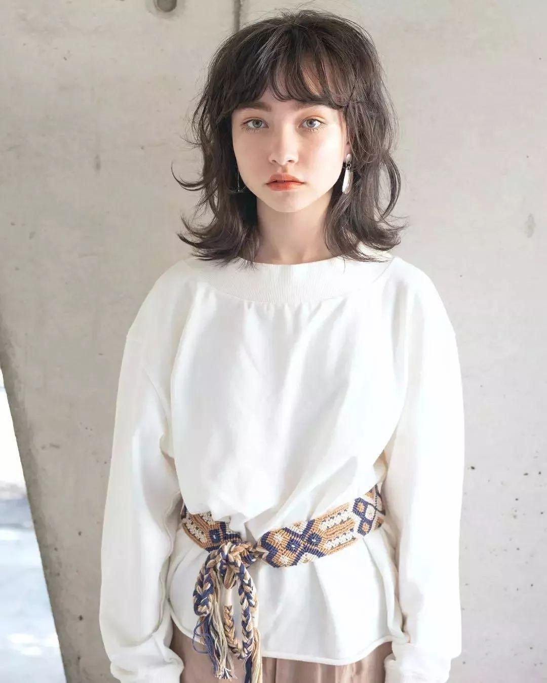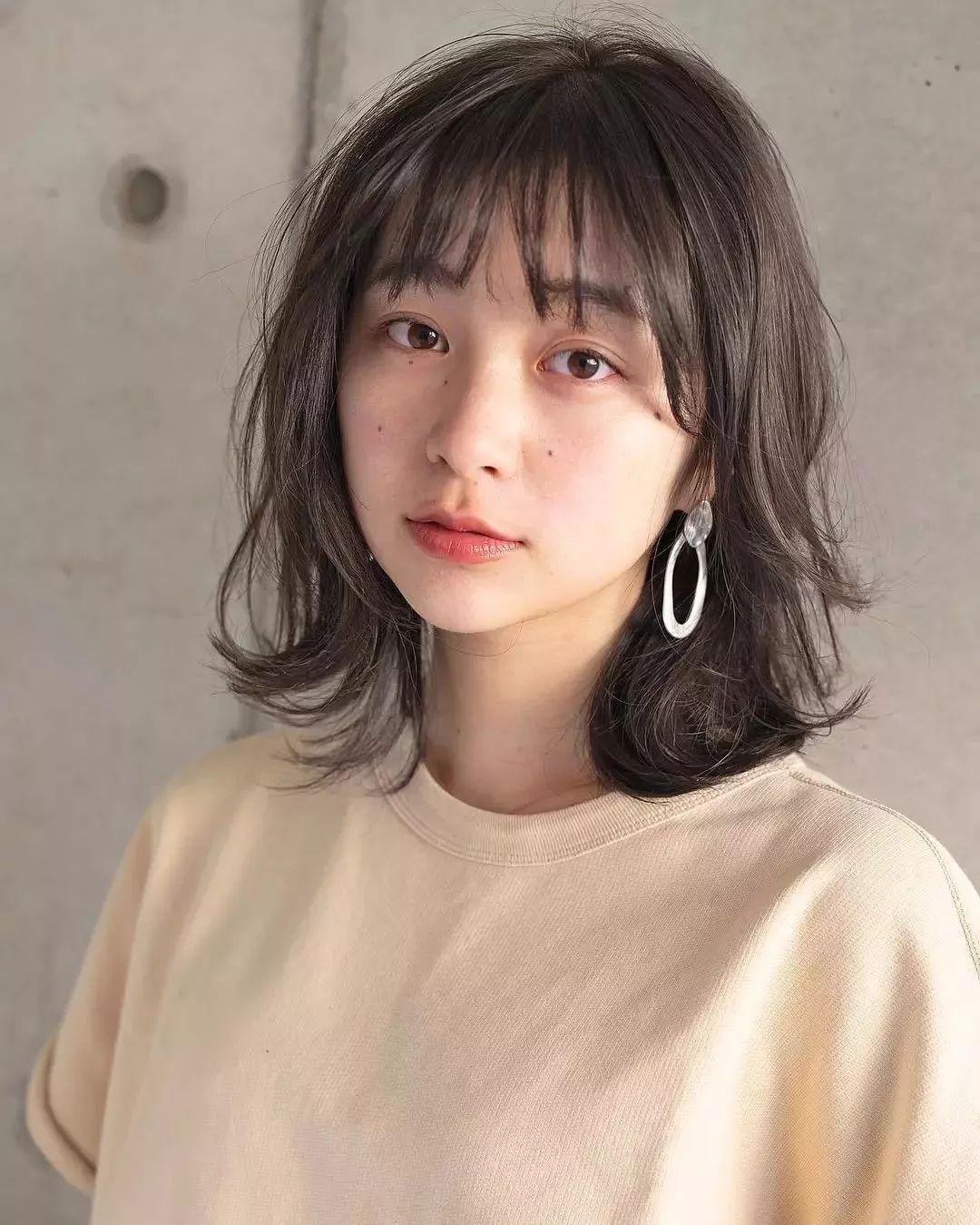 齐肩微卷搭配轻薄的刘海非常修颜,不会显得服帖,带点蓬松感的头发更适合发量少的妹子哦。