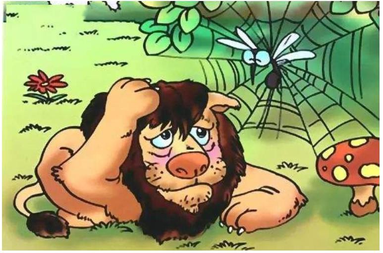 是谁?是蚊子,弄得大家如此惊慌失措!狮子东冲西突、翻身打滚,把力气都用光,它咕咚一声倒在地上,乞求和平。