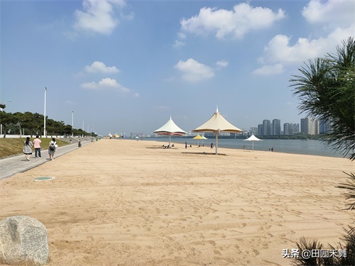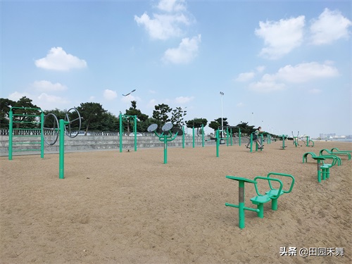 沙滩上还设有健身器材区,以方便市民和游客积极参与全民健身运动。