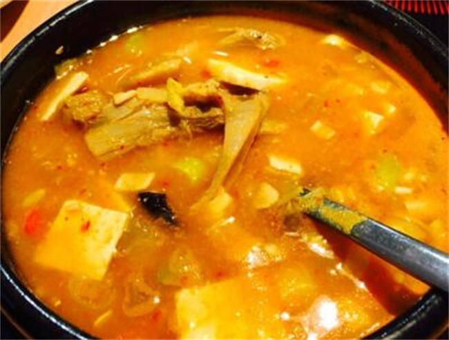 大酱汤也是韩国的一种传统美食,制作大酱汤的方法特别简单,食材基本上都是当季的蔬菜,但一定要有豆腐,豆腐切成一厘米左右的方块,青菜切成片,做大姜汤的时候必须要放上一个土豆,不然出不来那种香味,把所有的食材混合到锅里面,最好用淘米的水煮汤,少加一点盐和泡菜,然后加上韩国大酱,把所有的食材煮熟,汤汁变浓稠就做好了。