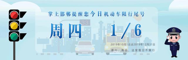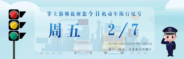 根据《邯郸市大气污染防治工作领导小组办公室关于市主城区和各县(市、区)城区实行机动车尾号限行的通知》(邯气领办〔2018〕311号)要求,邯郸市主城区和其他县(市、区)城区机动车自2019年10月7日至2019年12月31日与北京市同步轮换限行,周一至周五限行机动车车牌尾号分别为:3和8、4和9、5和0、1和6、2和7,尾号为字母的以最后一位数字为准。限行时间为7:00—20:00,周六、周日及节假日不限行。