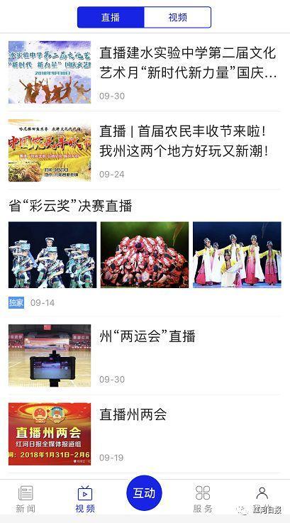 文字和图片展示的是静态的新闻或事件,视频、直播则能让读者更加直观地感受新闻现场的气氛,让您身临其境。2017年,红河日报在红河州建州六十周年期间的视频、图文直播浏览量接近120万人次。今年9月28日,建水实验中学的国庆文艺晚会直播浏览量也超过30万人次。因此,我们在“掌上红河”上专门设置了视频和直播栏目。您关注的新闻现场和视频信息都将在这里呈现。