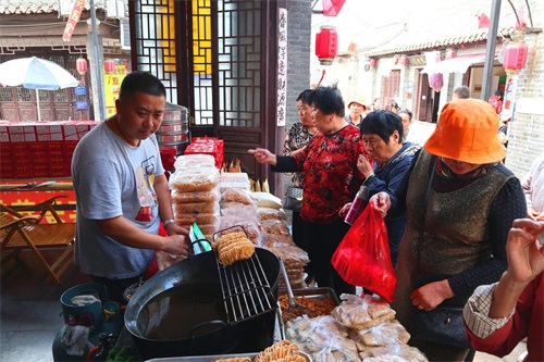 看看游人手里提的是什么?去过的人一定会知道,对了,那就是茶馓。在古镇的老街里走一圈,可以看到大小不下十家的小店在卖茶馓。