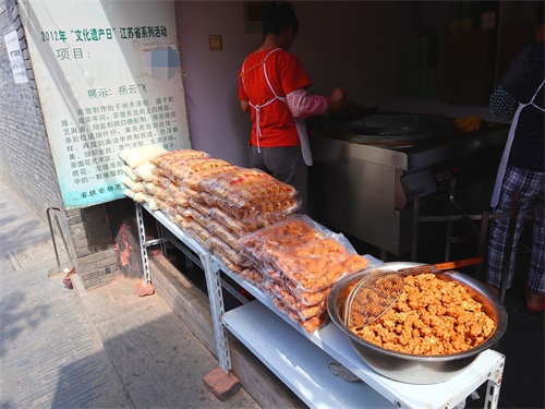 茶馓花式丰富,有梳子、菊花、扇子荷花、宝塔等形状,是淮扬美食文化中的“得意之作”。在古镇的日子里,外出回来,总会到这里买上一点茶馓,店主听说我要自己吃,就用简易包装给我称了5块钱的,晚上回客栈,沏上一杯香茶,边码字边吃茶馓,一个多么美好的夜晚。