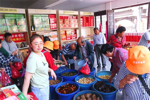 老年团队游客除了对茶馓感兴趣外,还十分喜欢这里的酱菜。这不,热火朝天地选起了酱菜。大爷大妈们游玩古镇,逛出了菜市场的感觉。