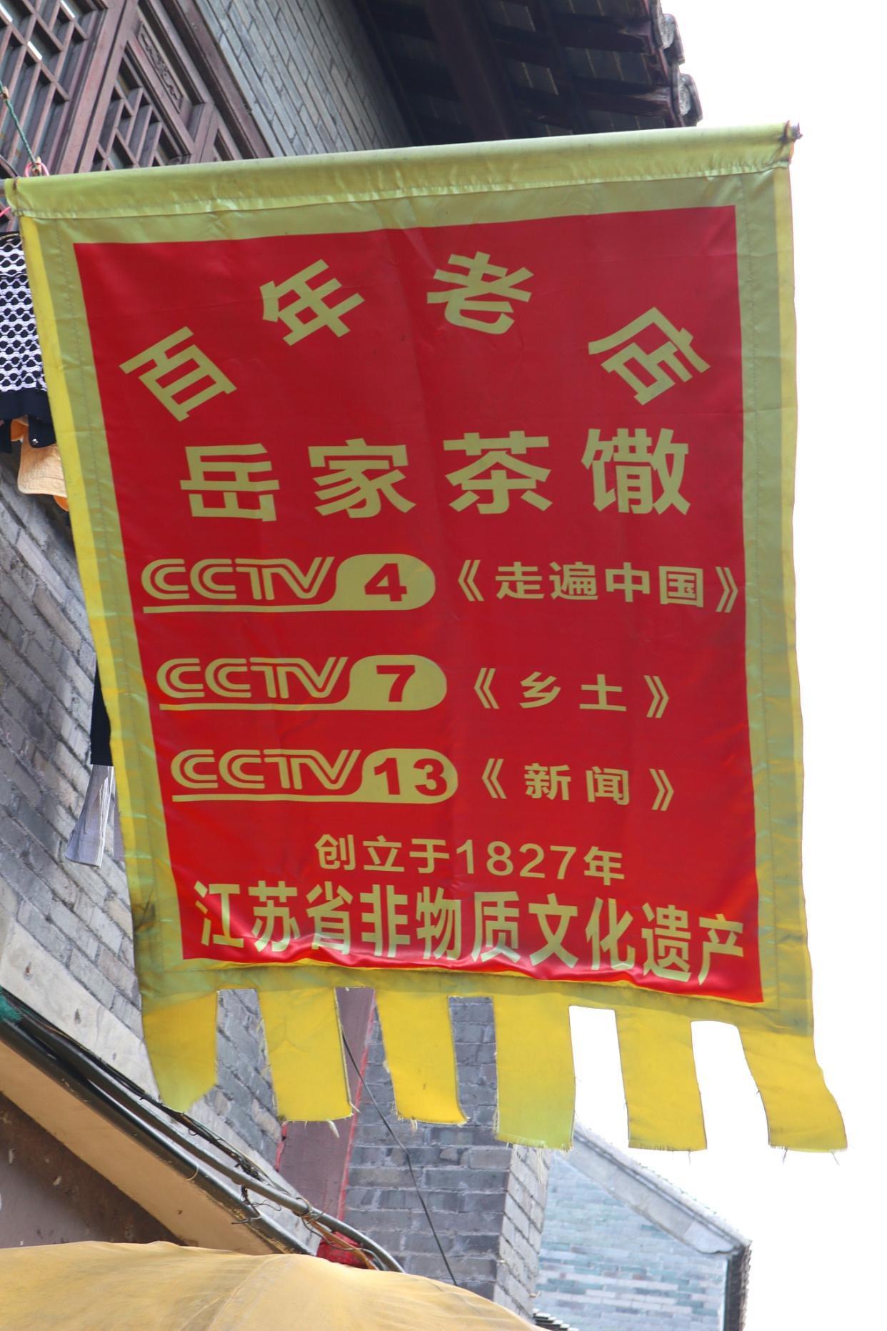 迎风飘扬的这家茶馓店的幌子上,骄傲地写着“创立于1827年”,并上过央视的三个节目,很是自豪。淮安茶馓制作始于明清初,盛于乾隆、咸丰年间。因为当时淮安茶馓做得最好的人姓岳,故又名“岳家茶馓”,又因为岳氏的家宅靠近淮安城鼓楼,所以也有人称其为“鼓楼茶馓”。这样看来,还是岳家茶馓比较会推销自己的品牌。