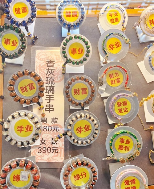 去雍和宫拜佛基本都会请法物,最知名的应该就是琉璃香灰手串啦。个人觉得雍和宫的手串都挺好看的,我请了绿色的琉璃香灰手串,护佑事业的,还给家人和朋友请了护身符。