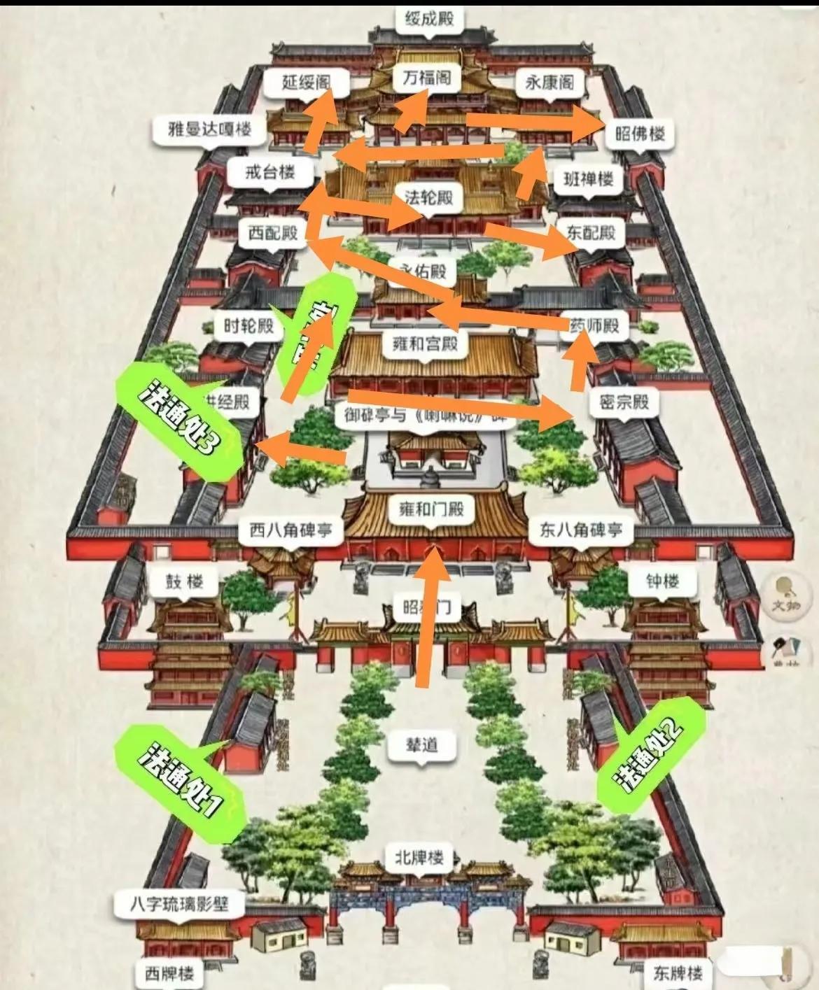 雍和宫以前是四大爷的府邸,有很多进,但每一进基本上都是中间主殿+两边配殿/偏殿的结构。所以简单来说,从北牌楼进,经过昭泰门,依次往里分为三路,各殿功用我也标出来了。