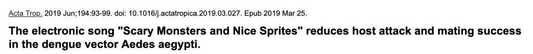 今年3月25日,学术期刊Acta Tropica上出现了一篇论文,标题是「论电子乐歌曲Scary Monsters and Nice Sprites对减少了埃及伊蚊的攻击行为和交配成功率的作用」。论文里提到:「目前正在进行的研究是为了验证电子音乐对埃及伊蚊(登革热病毒携带体)的觅食活动、吸血和交配成功率的影响。」