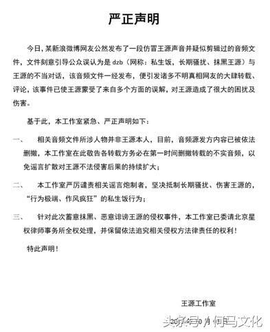 就在今日不久,王源工作室发表了一份声明,网上号称是王源和dzb(戴志斌)对话的音频是伪造的,音频文件并非是王源的真实声音,现在王源工作室已经拿起了法律武器,所以,希望大家不要转载并及时撤销。