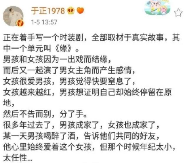 说到于正,相信大家一定都不陌生吧?近两年来,于正这个名字在圈内是非常火的!有非常多的好作品都是由他“制作的”,例如:《美人心计》《宫锁心玉》!就在近日,他又被网友传出正在制作“新作品”的消息!先简单的说一下事情的起因!2020年1月5日,有网友在微博上曝出了于正的“最新动态”!这位网友在微博上是这样写的:“于正在近日秒删了一条微博!他在删掉的微博上说自己正在创作一部时装剧的剧本!还将剧本的大概情节发了出来:男女主都是明星,二人因戏生情,结果女主越来越红,男的却停在了原地,二人最后各自结婚,但是男主还爱着女主。于正说这个故事是真实的!”