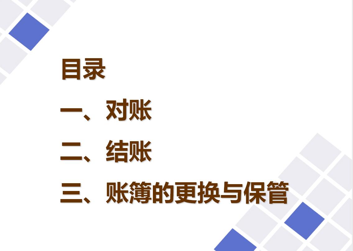临近月末,相信各位会计小伙伴们都在为月末结账,对账而发愁,不要着急,今天小编为大家整理了关于对账及结账的方法和流程、账簿的更换与保管等方面的资料(共53页PPT课件),帮助大家更快的完成手里的工作,跟着小编一起来学习吧~~