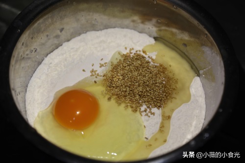 1、 面粉中打入一个鸡蛋,适量食用油,芝麻和一小勺食盐。