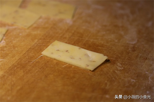 6、 将两片切好的小面片重叠在一起。这样炸好的排叉是双层的,如果只放一片就是单层。我个人感觉单层的口感更酥脆,尤其是折叠好后重叠在一起的部位炸得更透。双层的炸出来外形更漂亮。