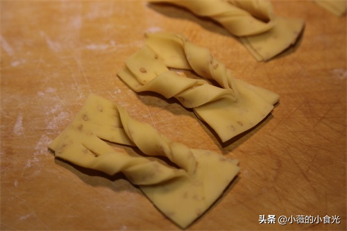 8、 将一边面片的两个角从中间的长口中穿过再向两边轻轻拉伸,一个排叉的生坯就做好了。