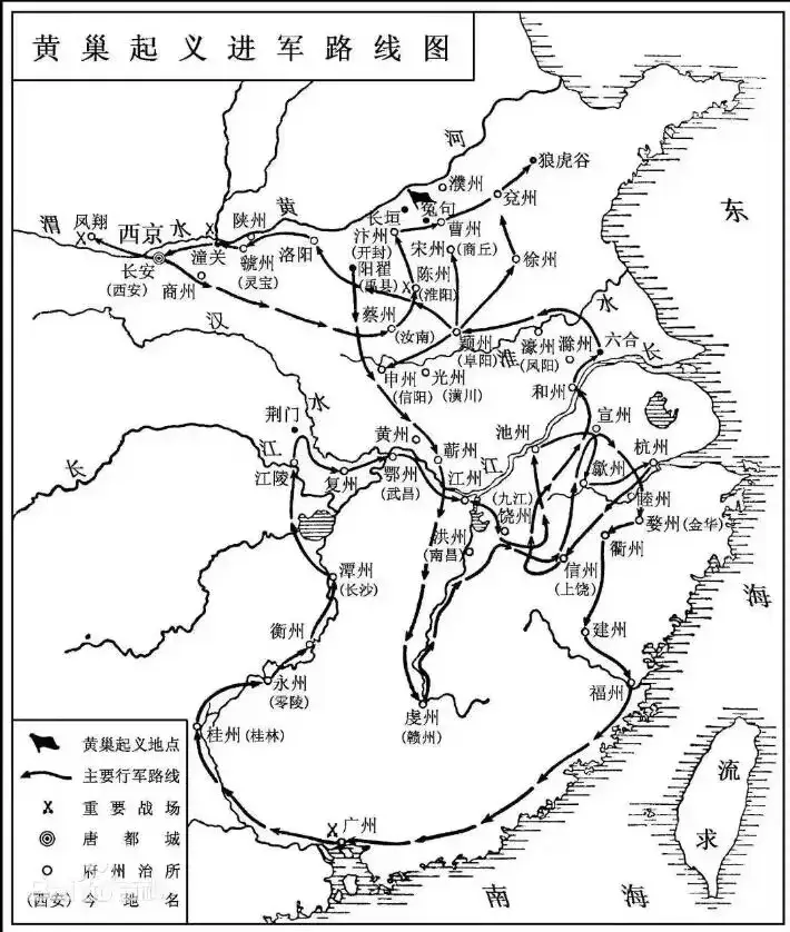 黄巢起义军线路图 来源:网络