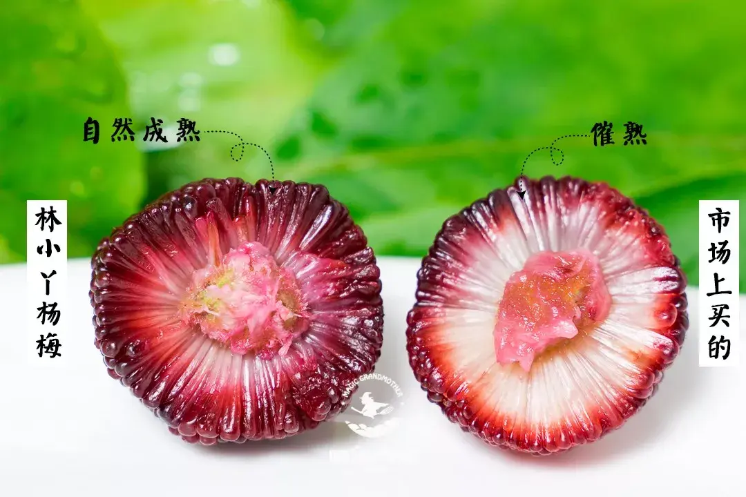 为了对比,小编在市场上买了一些杨梅来做实验。可以分辨的是,林小丫家自然成熟的杨梅果肉呈渐变色。对比市场上买的果肉发白的杨梅,好与坏的区别不言而喻。
