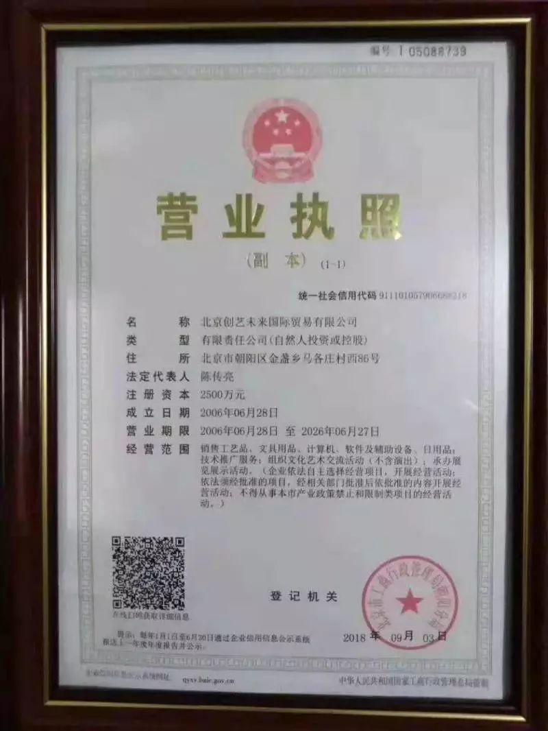 北创国贸是否存在?到底有没有在工商局注册过?今天下午,记者通过百度搜索北创国贸之后,相关简介还是比较清楚的。该公司主要经营钻石画等一系列设计新颖、艺术丰富的手工艺产品的大宗采购及国内外贸易,订单多元化也是未来业务发展方向。随后,记者又查询了国家工商总局的“国家企业信用信息公示系统”,再次输入北创国贸单位名称之后查到了登记信息:该公司是一家私营企业,成立于2006年6月,统一社会信用代码齐全。其营业执照上显示的营业期限是到2026年6月。