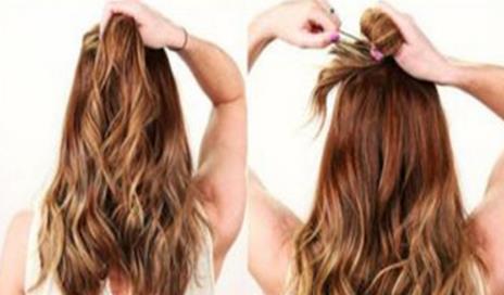 将其中一侧的头发如帘布般掀在顶髻周围,再将发尾绕到发髻的另一侧。